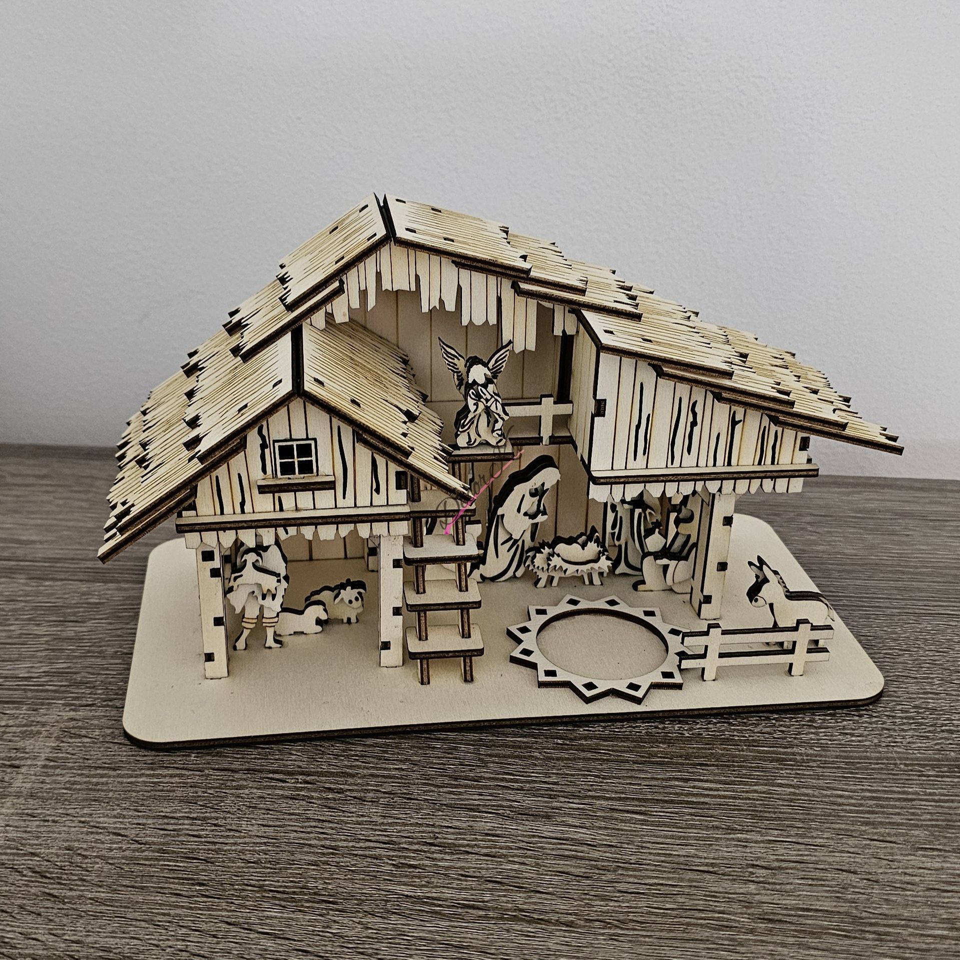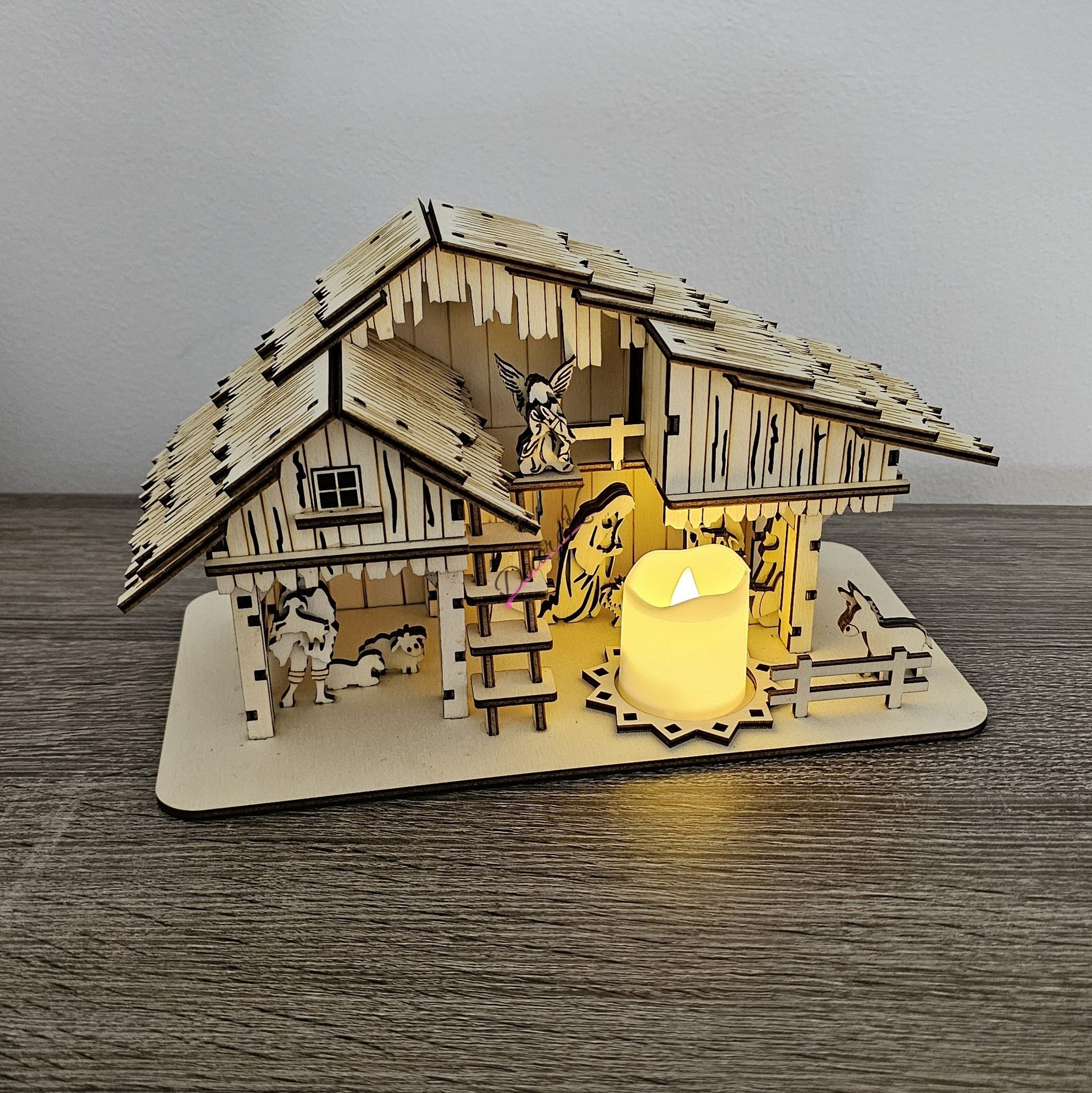 Vyrezávaný betlehém s figúrkami a LED sviečkou.