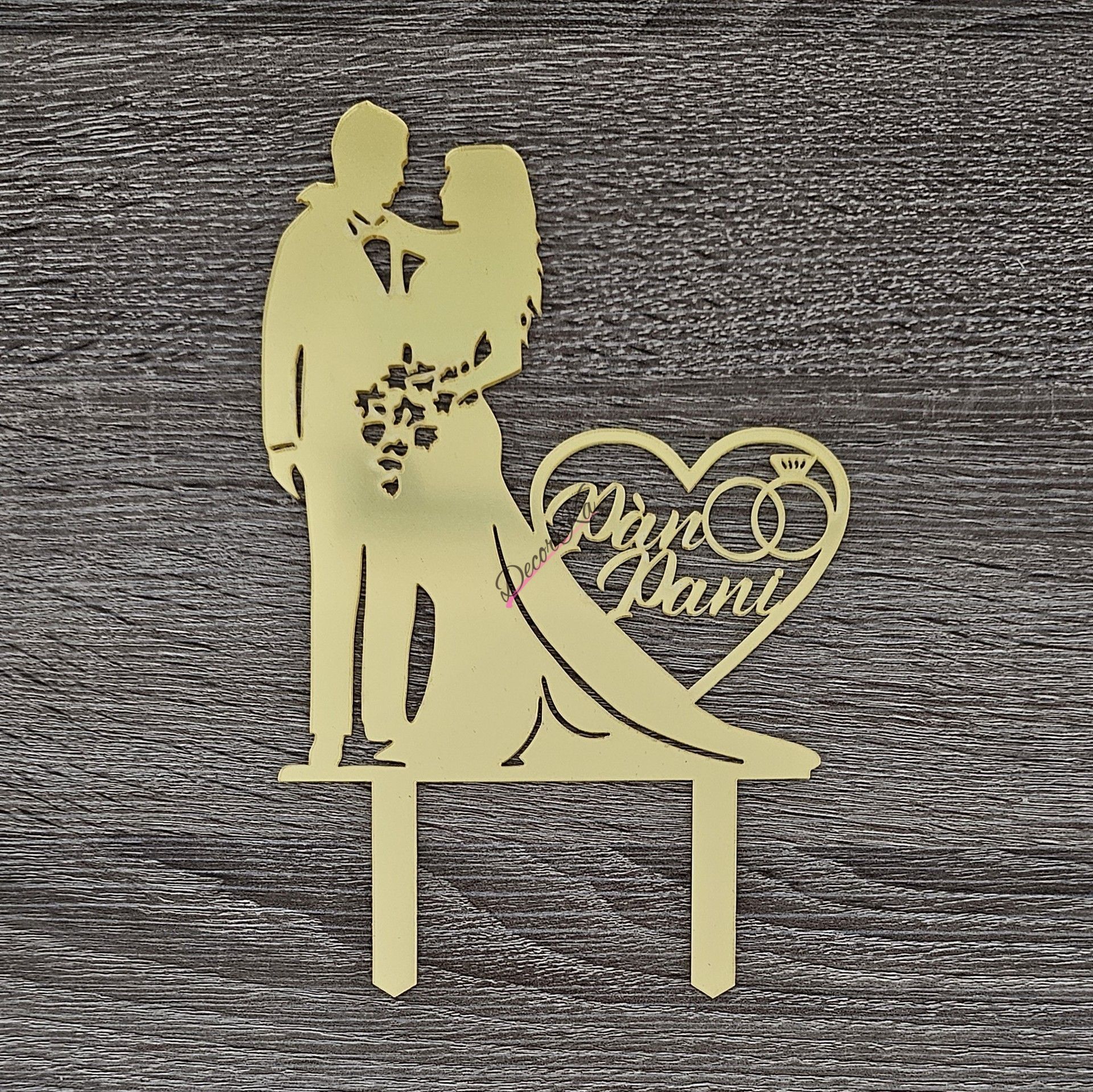 Zlatý zrkadlový zápich novomanželov s nápisom Pán a Pani v srdci.
